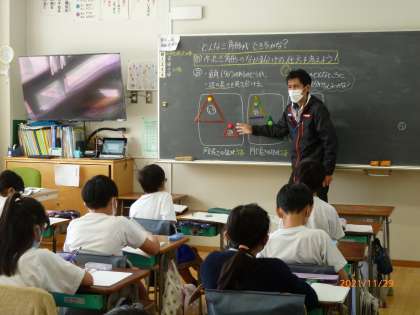 長さの異なる色棒を使って、グループや全体でどんなときに二等辺三角形あるいは正三角形になるかを確認していました。