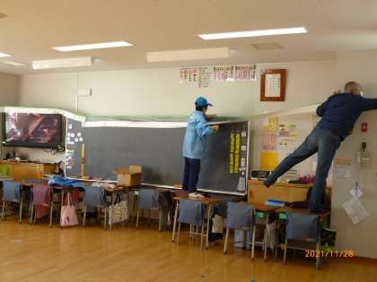 児童の机やいすを前後に移動して家族用スペースを設定したり、教室前後にある掲示物を保護するための養生を実際に行ったりしていました。
