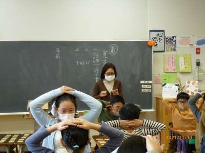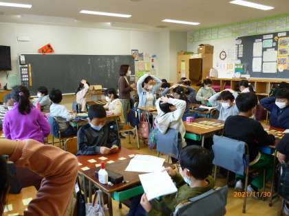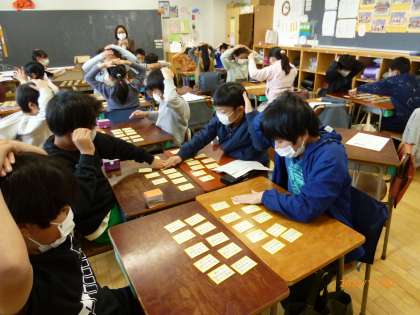 百人一首の短歌を何度も詠んだりして覚えてきたことをかるたで確認です。先生が上の句を読み上げると、すぐ手がのびる子。う〜ん、と悩む子。様々でした。でも、どのグループも健闘していました。