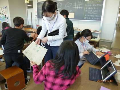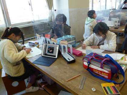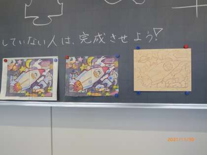 「木工パズル」のアイデアスケッチをしているところです。タブレットで画像を検索し、気に入った絵を分割して描いたり、先生にどんなパズルがいいか相談したりしていました。完成までの見通しとして先生が作った見本のパズルが貼ってあります。すてきな作品でした。みんなは、どんな作品を作るのかが楽しみです。