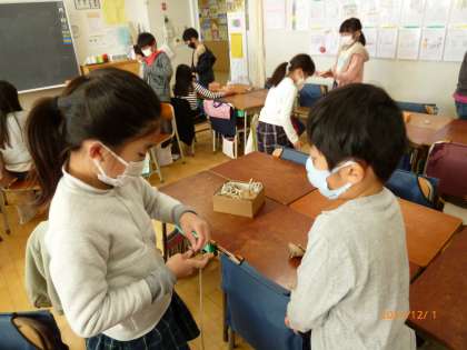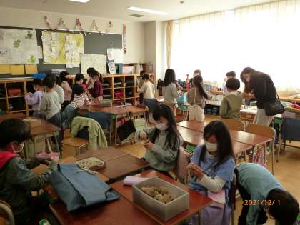 2年生のクラスでは、昔遊びを実際に体験して昔の子供たちが遊んでいた遊びに慣れ親しんでいました。こま、めんこ、お手玉、けん玉などがあります。それぞれの場所で慣れるまで苦労しているようでしたが、何度も遊んでいるうちにコツをつかんで友達に教えている子もいました。