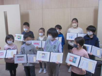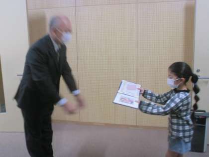 歯のポスターコンクールで、審査委員会賞・優秀賞・佳作をいただいた子たちへの、表彰の様子です。