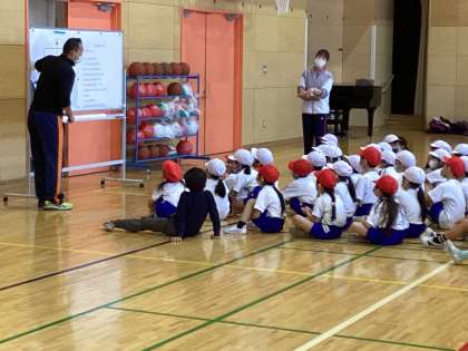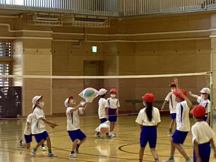 1年生の授業の様子です。体育館で2クラス一緒に流れ星ゲームをやっているところです。