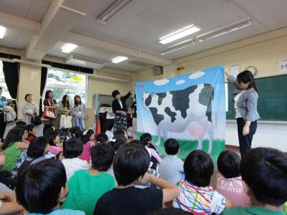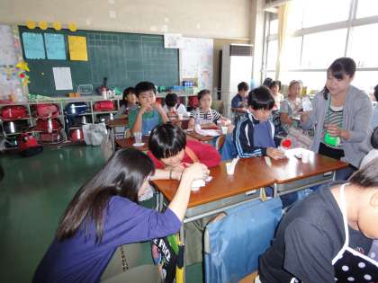 牛乳がどうやってできているのか、骨を強くするするひみつ、などをクイズなどを通して楽しく学びました。実際に生乳からバターをつくり、楽しくおいしく実験しました。(明日、明後日も行われます)