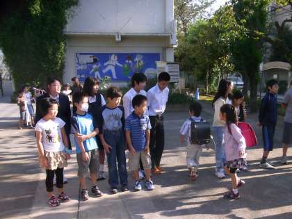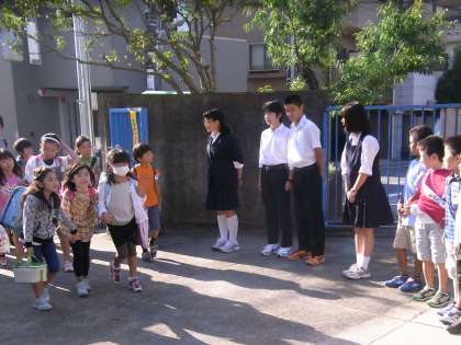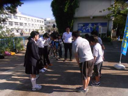 今日のあいさつデーに、砧中学校の生徒4名が来てくれました。小学生のあいさつ隊とともに、竹内門のところで登校してくる子どもたちに、元気にあいさつしてくれました。砧の学び舎では、各小学校出身の生徒があいさつでーに出向き、小学生にあいさつをするという取り組みをはじめています。小ー中連携の一環です。中学生の子の前向きな姿が、子どもたちのあこがれになっていくと確信しました。中学生の皆さん、ありがとう!