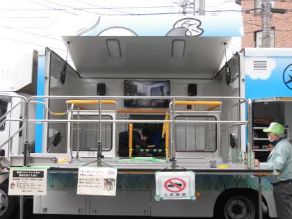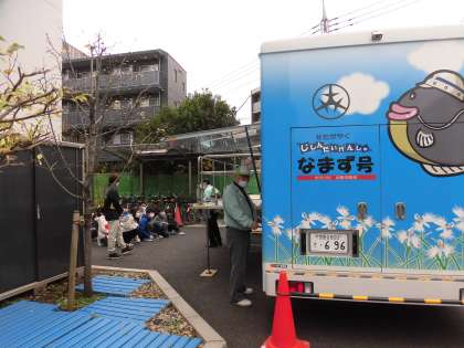 避難訓練後に6年生は起震車「なまず号」