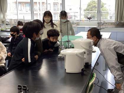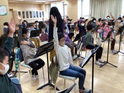 続いて、理科の授業です。ものの体積についての実験で、グループごとに前の模擬実験の様子を見に来ていました。音楽の授業では、パレードホッホーの曲を聴いて感想を発表し合っているところです。