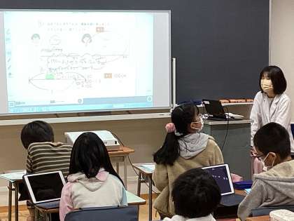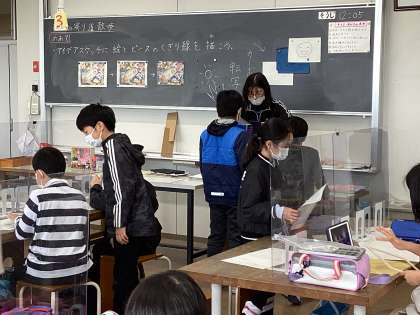 5年生の授業の様子です。算数では、割合の学習をしています。図工では、木工パズルを作っていて、今日は下絵を転写したり、木に写し取った下絵の線に沿って電ノコで切ったりし始めていました。