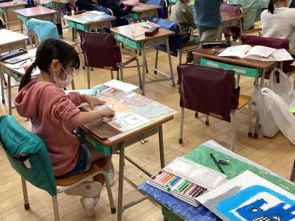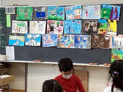 1年生の図工の様子です。お知らせしよう、ニッコリニュースの絵を描きました。みんなのお知らせしたいことがいろいろ違っていておもしろいですね。