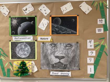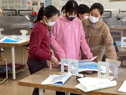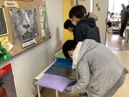 続いて図工の授業の様子です。版画の刷ったものから一番の自信作を決め台紙の色を選んだりしていました。竹田先生の作品からも出来上がりイメージが分かりますね。