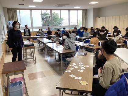 理科では、水の入った瓶に石に見立てた吸水スポンジを入れて何回も振った後どうなるかを調べていました。流れる水のはたらきの学習です。外国語では、習った表現をよく聞いて札を取るカルタをしていました。