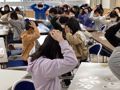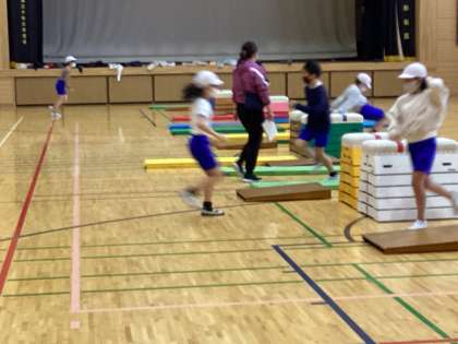 外国語のカルタの様子の続きと体育の跳び箱の様子です。抱え込み跳びの練習をしていました。