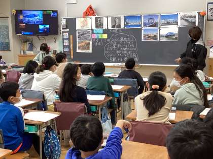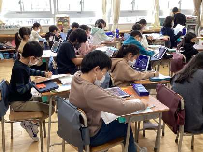 社会科の授業の様子です。東京のまちをきずいた人々の学習で、資料を参考にしながら橋を築いていった経緯などを学んでいました。