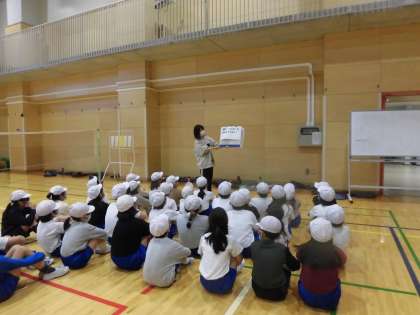 はじめにめあてを確認しました。全員が目を向けて聞き、学級全体にやる気が感じられました。「今日は、3試合できます!!」と先生が言うと、みんな喜んでいました。