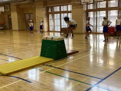 体育館では、跳び箱の学習をしていました。まず最初に手の突き放しをした後、自分に合った高さの跳び箱で抱え込み跳びの練習を行いました。社会科では、自動車を作る工程についてビデオで確認しながらメモを取っていました。