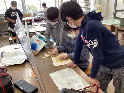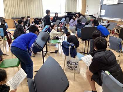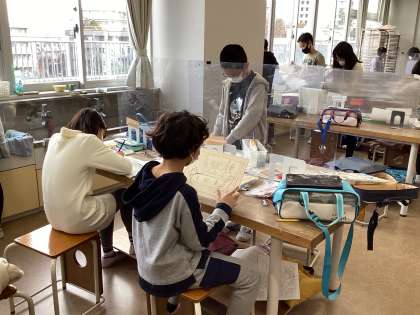 音楽の授業では、体を動かしながら歌のイメージを広げていました。図工の授業では、木工パズルの工程が進み、絵を転写した板に色を塗ったり、電動ノコギリで切ったりしてだいぶ出来上がってきました。