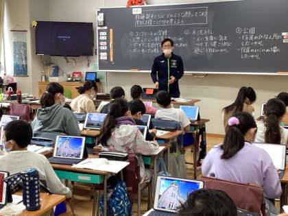 体育と社会の授業の様子です。外の体育では、ベースボール型ゲームでTボールをやっている所です。