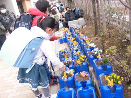1年生が植えたビオラの花がとてもきれいに咲いています。登校してすぐに水やりをする1年生。あさがおを育てて、植物を大切にする心が育まれていることが、水やりをする様子から分かります。