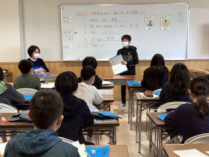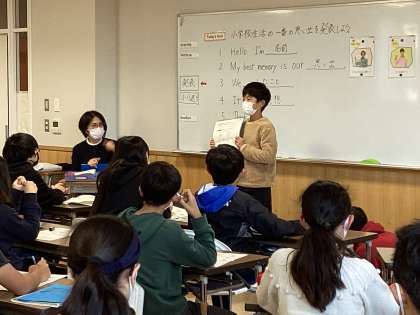 外国語の授業の様子です。自分の思い出について書いたことをみんなの前で発表していました。