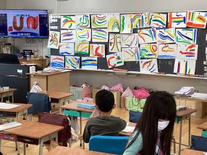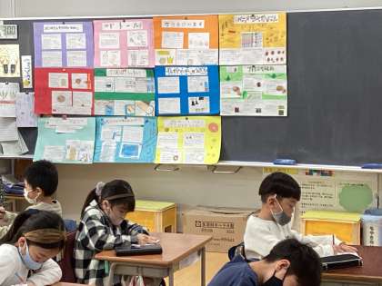 学習のまとめの時期となり、まちたんけんで調べたパンフレットや図工で描いた作品が出来上がり、すべてそろってみると、なかなか壮観です。