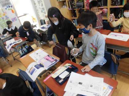 ペアでどのように鳴らすか相談しながら音楽を作りました。
