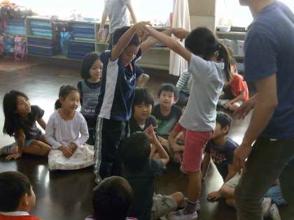 今日は2回目のパブリックシアターです。前半戦は2人組、3人組、6人組でいろいろなものを体で表現する取り組みです。後半は3匹の子ブタの物語の4匹目の子ブタになって、自分たちで考えたお家を体で表現するという活動でした。友達と協力するということ、体で表現するということ、とても大事なことを学習していました。パブリックシアターの皆さん、ありがとうございました。
