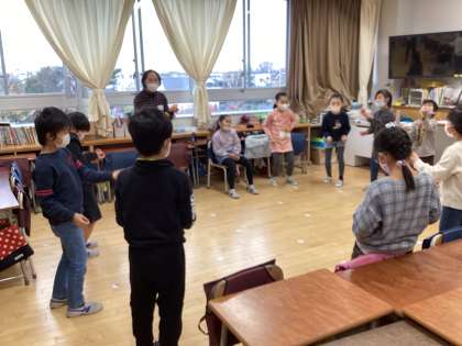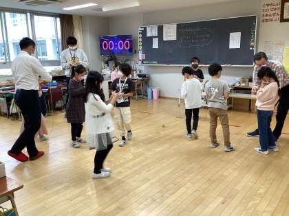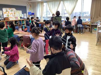 教室では、こま、あやとり、お手玉で遊んでいるところです。地域の方々の丁寧なご指導のおかけで、できるようになってうれしそうにしている子の姿が印象的です。