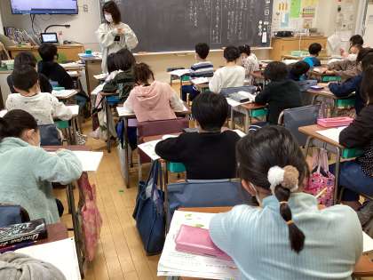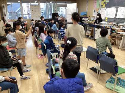 音楽では、学期末の合奏発表会に向けて担当する楽器ごとに演奏するパートを確認していました。国語では、冬のくらしという単元で、冬に関係のある言葉を集めた後、それらの言葉を使って文章を作っていました。