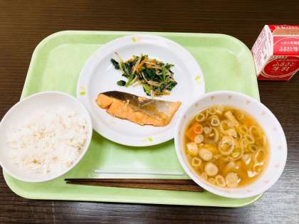 今日は、ごはん、鮭の塩麹焼き、野菜のごまあえ、けんちん汁、牛乳です。