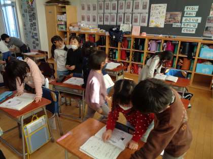 楽しい「よう日うた」ができたので、みんなの作品を自由に読みにいく『学びのたび』をしました。