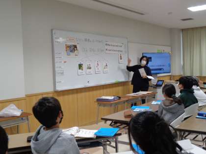 授業の最初に、天気や日付を確認しました。先生が英語で尋ねると、子供たちもすぐに英語で答えました。毎回のことなので、すっかり慣れています。