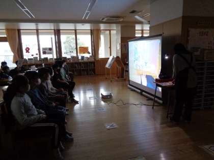 司書の先生が毎回、大型スクリーンに本を映して、読み聞かせをしてくださいます。クラスみんなが本に引き込まれている様子は、とてもすてきです。