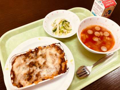 今日は、カレーミートドリア、グリーンサラダ、米粉マカロニ入りトマトスープ、牛乳です。