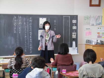 3年生が学級会で自分の意見を書いている場面、日本語で五色百人一首に取り組んでいる