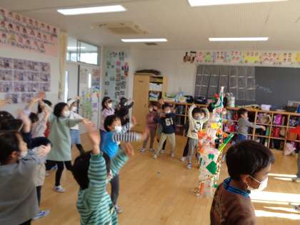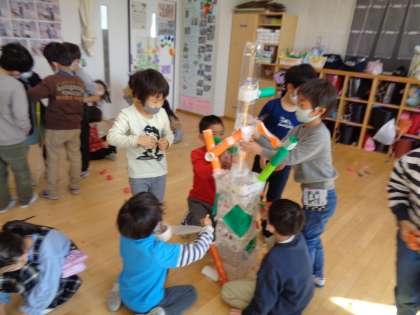 お楽しみ会を行っていました。みんなで話し合ってクリスマスツリーを作ることになりました。持ち寄ったペットボトルを木の幹にして、トイレットペーパーで枝を作りました。折り紙で飾り付けをしました。ツリーのてっぺんに☆をつけて完成です。