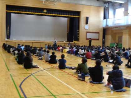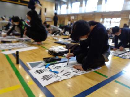 体育館は、ピーンと張りつめた空気で、私語は全くありません。先生からの話があり、書き初めがはじまりました。