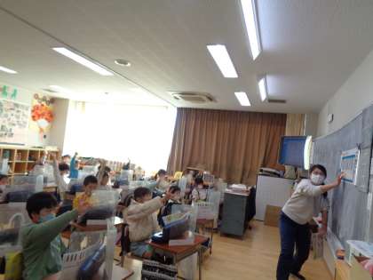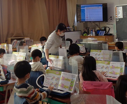 指の動かし方を確認して、音を出さず鍵盤の上で「ゆびくぐり」を何度も行っていました。先生が、「できてるよ!」「そう!じょうず!」と声を掛けながら一人一人見てくれました。