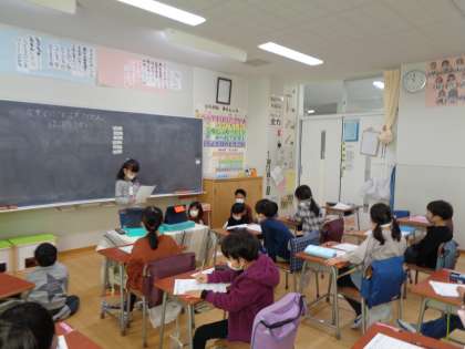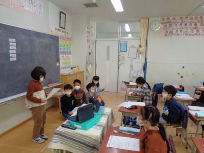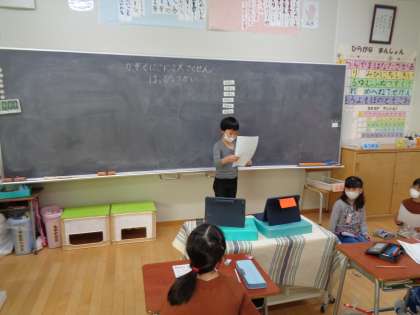 家族がにこにこ笑顔になるために、「おうちのお手伝いをしよう!」とみんなで作戦を立てました。そして、冬休みに自分で決めたお手伝いに取り組みました。今日は、その発表会です。「おさらあらい」「せんたく」など自分で取り組んだお手伝いのコツややり方、また、難しかったところや楽しかったことを友達に伝えました。
