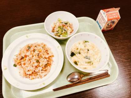 今日は、おまめチャーハン、スタミナサラダ、玉子とわかめのスープ、牛乳です。