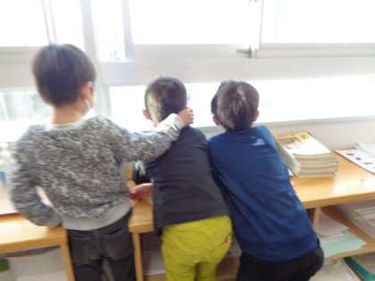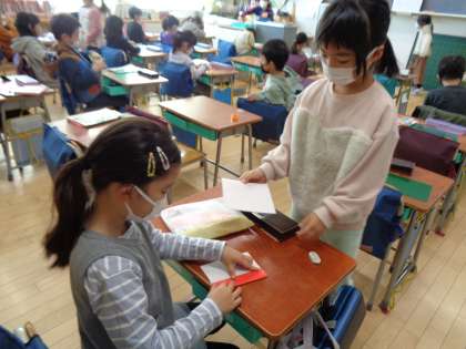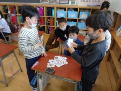 トランプ、折り紙、読書…など好きなことをして過ごしていました。校庭で遊んでいる高学年をうらやましそうに見ている子達もいました。低学年の外遊びは水曜日ですよ。お楽しみにね。