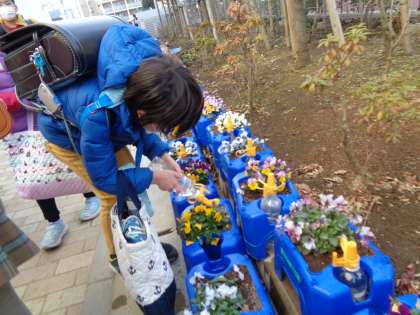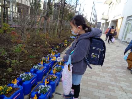 月曜日の朝、ビオラに水をあげている1年生がたくさんいました。お休み明け、お花のことを気にかけているのがやさしいですね。