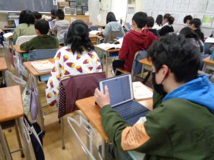 教科書の三編の詩を読んで、感想をロイロノートに書いてみんなで共有しました。じっくりと詩のおもしろさを味わったり、友達の感じ方を知ったりと、知的好奇心が満たされているようなしっとりとした雰囲気でした。