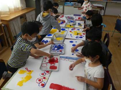 ローラー、プリンカップ、スポンジなどの道具に絵の具をつけて、画用紙に模様をつけています。最後には、指に絵の具をつけて、自由に描きました。