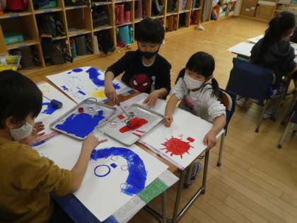 1年生の図工「スタンプ スタンプ」の様子です。