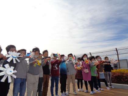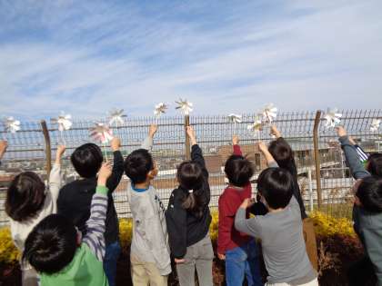 屋上に行ったとたんに、強い風を受けて羽がくるくる回り、「すごーい!!」と感動でいっぱいでした。たくさん走って、思いっきり楽しみました。