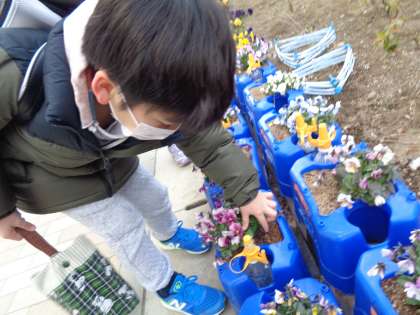 1年生が育てているビオラの花の横からチューリップの小さな芽が出ていました。寒さの中にも春が少しずつ訪れてきています。