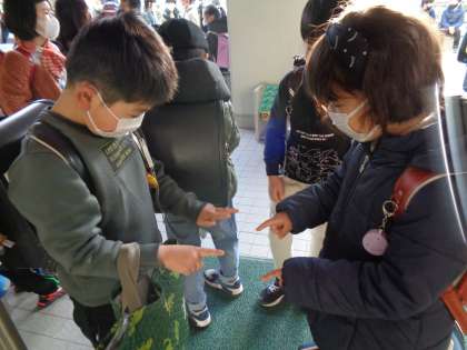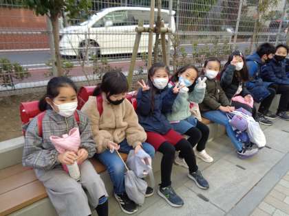 2年生の女の子がベンチでまったりと待っていたり、1年生が指遊びをしていたり、チャイムが鳴るまでののんびりとしたひとときです。