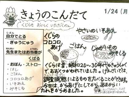 >今日は、ごはん、鯨のコロコロ揚げ、野菜の磯あえ、じゃがいものみそ汁、牛乳です。