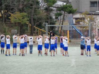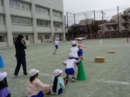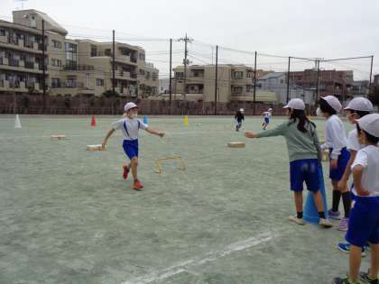 ハードルなどを跳び越えて走ります。リレーにすることで、もっと速く走ろうとするので、よりリズミカルに跳ぶことができます。友達を応援して、とても盛り上がっていました。