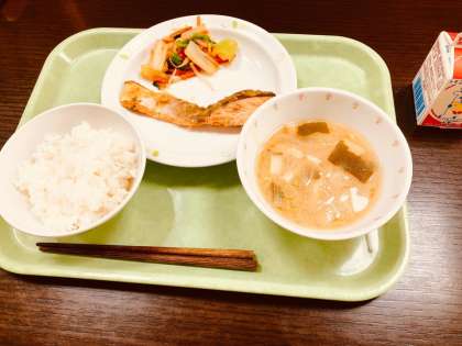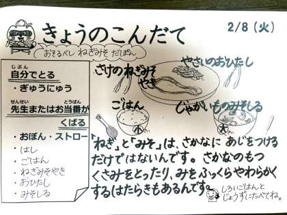 今日は、ごはん、鮭のねぎみそ焼き、野菜のおひたし、じゃがいものみそ汁、牛乳です。